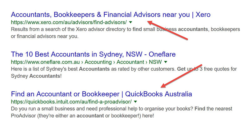 If you’re an accounting practice, you can become a Xero Advisor or QuickBooks ProAdvisor to get listed in their directories. This means your business will may up when someone searches in Google for for a ‘Xero accountant’ or ‘QuickBooks accountant’ and even generic terms like ‘Find an accountant’.