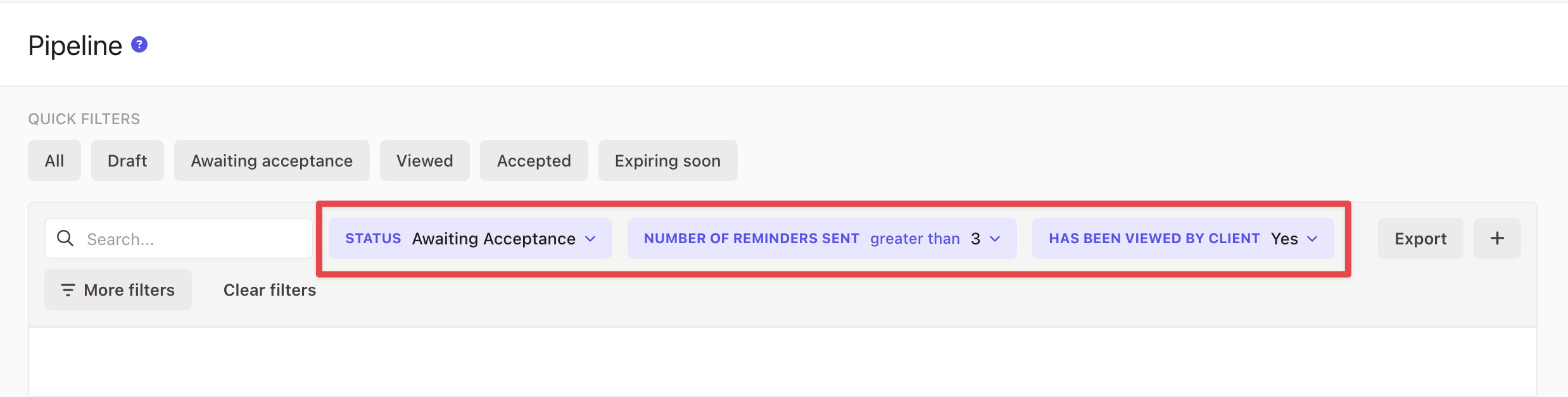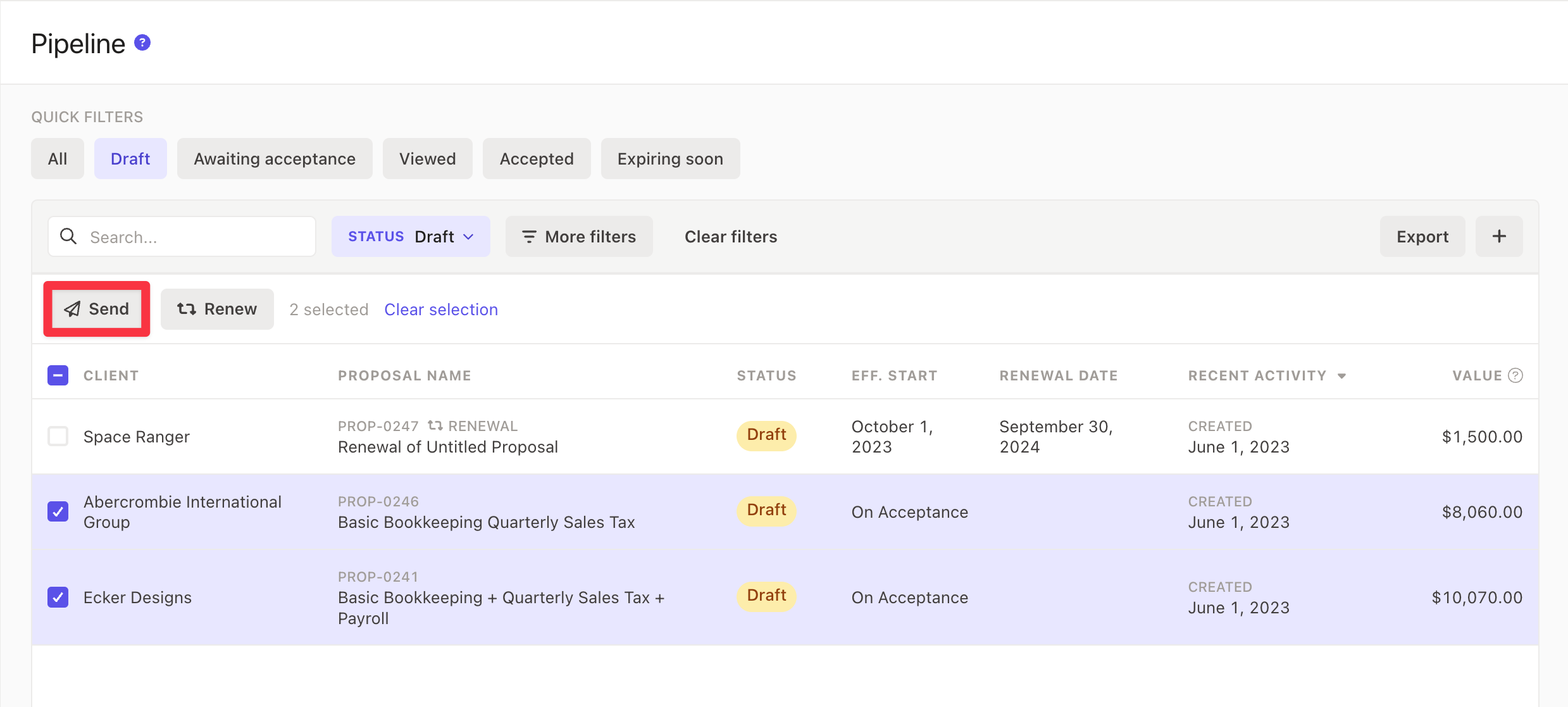 Navigate to your Pipeline tab and create a filter for Draft or Awaiting Acceptance proposals.