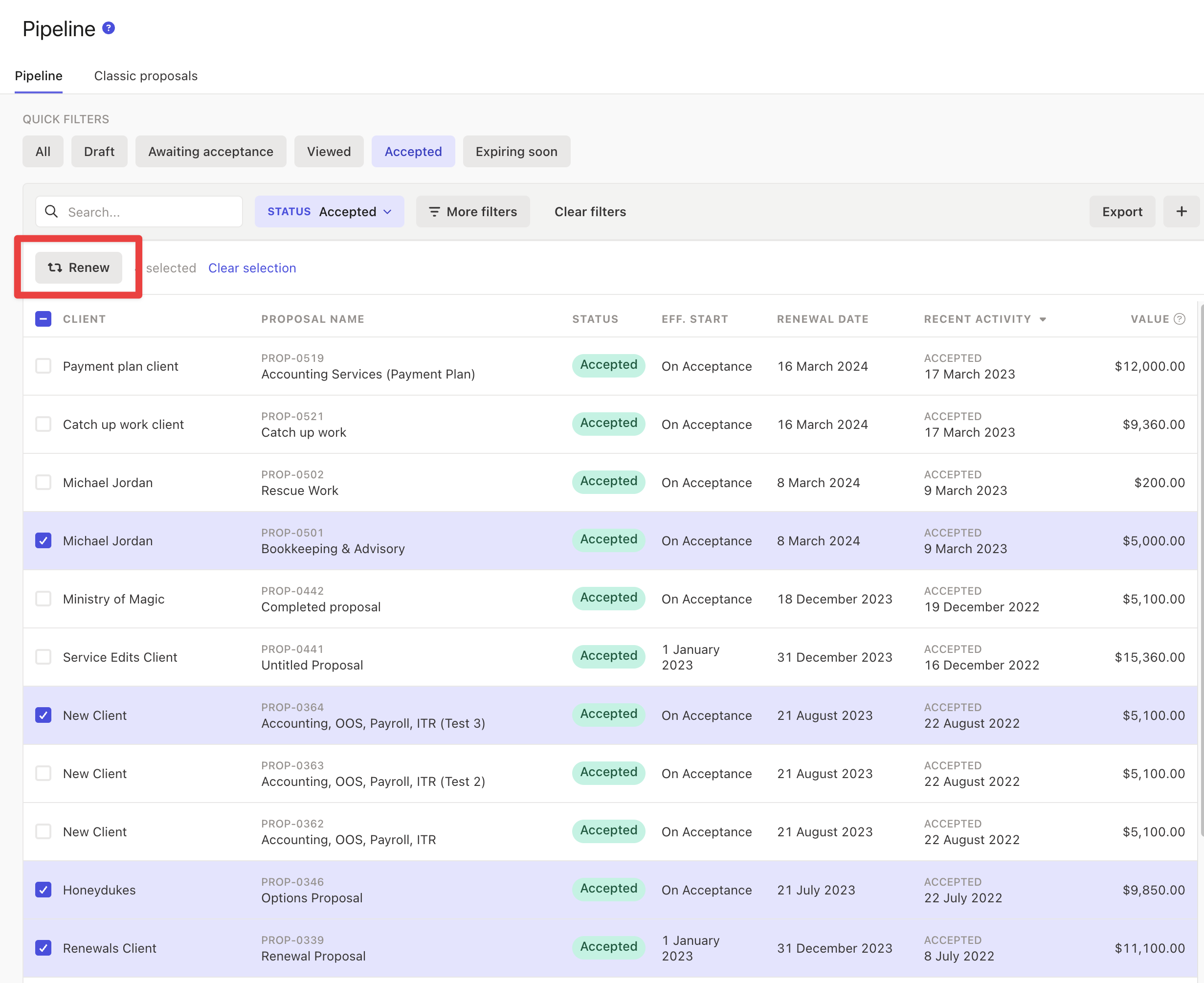 Navigate to your Pipeline tab and create a filter for Accepted or Completed proposals.