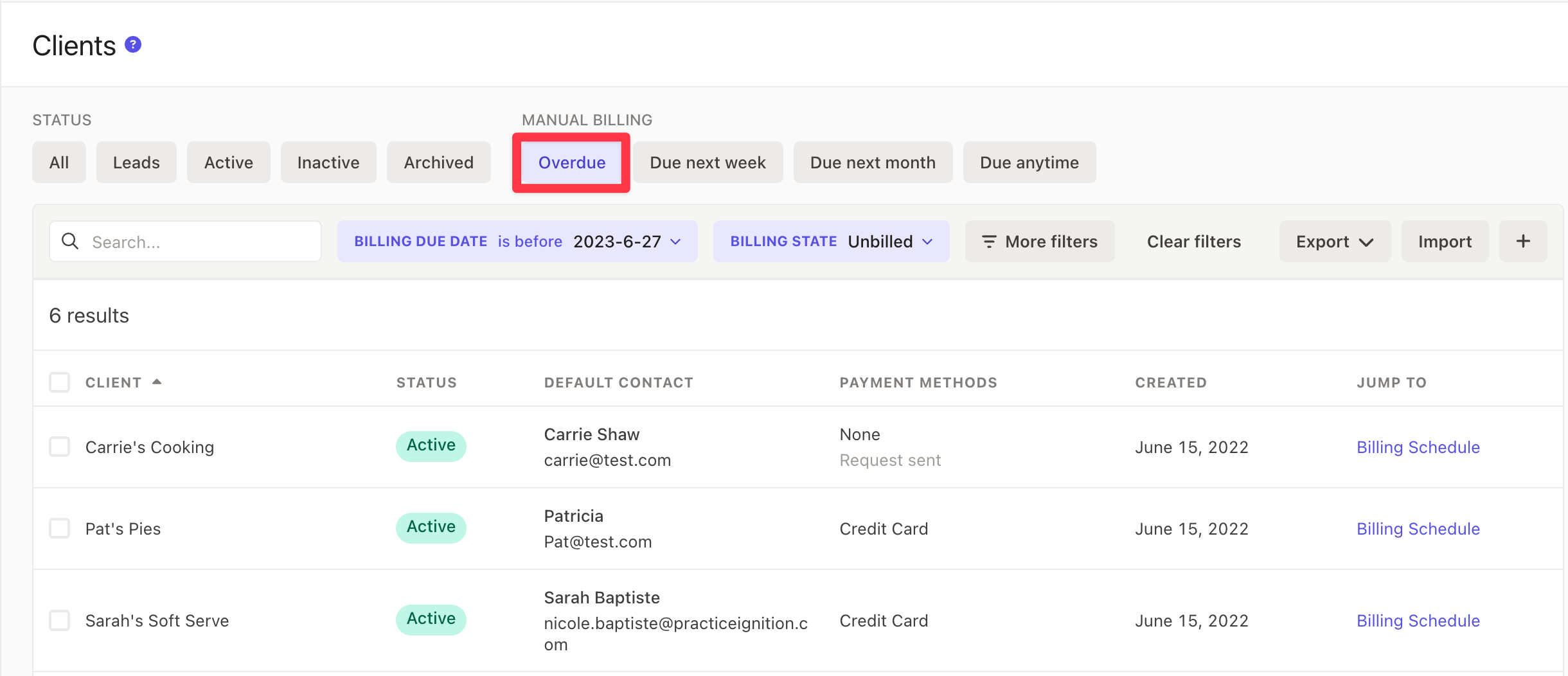 Navigate to your Clients tab and click the Overdue filter under the Manual Billing section.