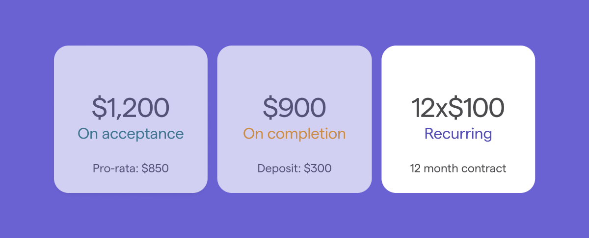 Julia owns a marketing agency and wants to increase recurring revenue. With Ignition's flexible billing options, she can create proposals for monthly or yearly billing for clients who are interested in ongoing marketing services. Ignition also allows Julia to bill clients by the hour, charge a set fee for project-based work or charge a retainer. She can even charge a subscription (also known as a recurring billing model) to bill customers on a regular basis. With the ability to customize billing frequencies, she can set up automatic payments and focus on growing her agency, knowing she has a steady stream of revenue coming in.