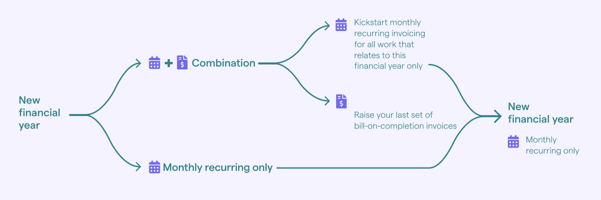 With this method, you kickstart monthly recurring invoicing from the beginning of a new financial year for all work that relates to that financial year only.