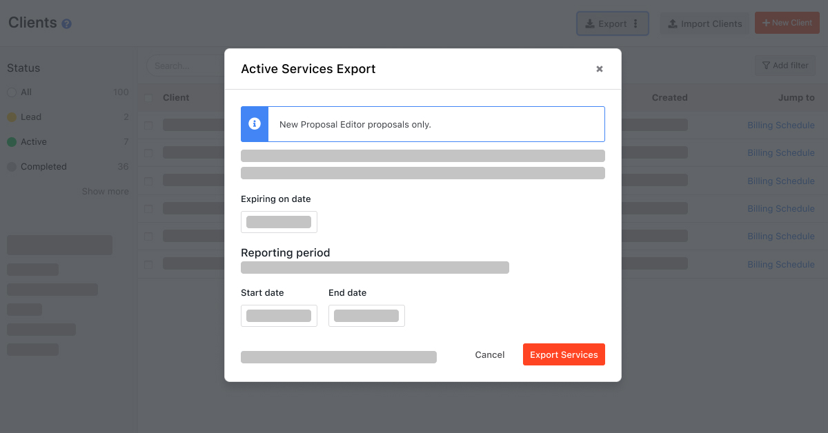 If you’re using our New Proposal Editor, you can now easily track all your active services for a client using our new ‘Active Services Export’ feature in the Clients tab. The purpose of this export is to give you a consolidated view of your active services to inform your renewals planning.