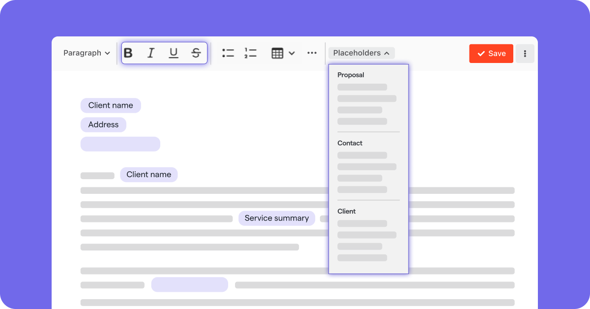 If you're on our Professional or Scale plan, you can now easily create your own customizable proposal templates using our New Proposal Editor. Simply build a new proposal or save an existing draft as a template in your custom template library. Custom proposal templates can help you simplify your client proposal process by creating standardized templates for your most popular services, and getting high quality proposals out the door faster. You'll also be able empower your team to create proposals using templates to engage clients consistently with less hand-holding. Learn more