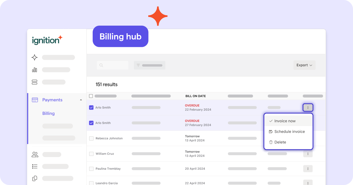 Reclaim cash flow and stay in control of client billing with the new billing hub in Ignition. Access your upcoming manual billings across all clients in one consolidated view and choose to invoice instantly, or schedule for later.