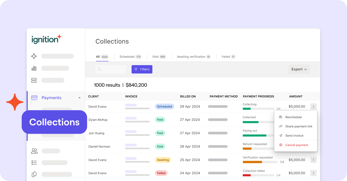 Manage payments more effectively with the new and improved payment Collections page! You'll now be able to track payment statuses more easily, apply filters and take action such as rescheduling collection.