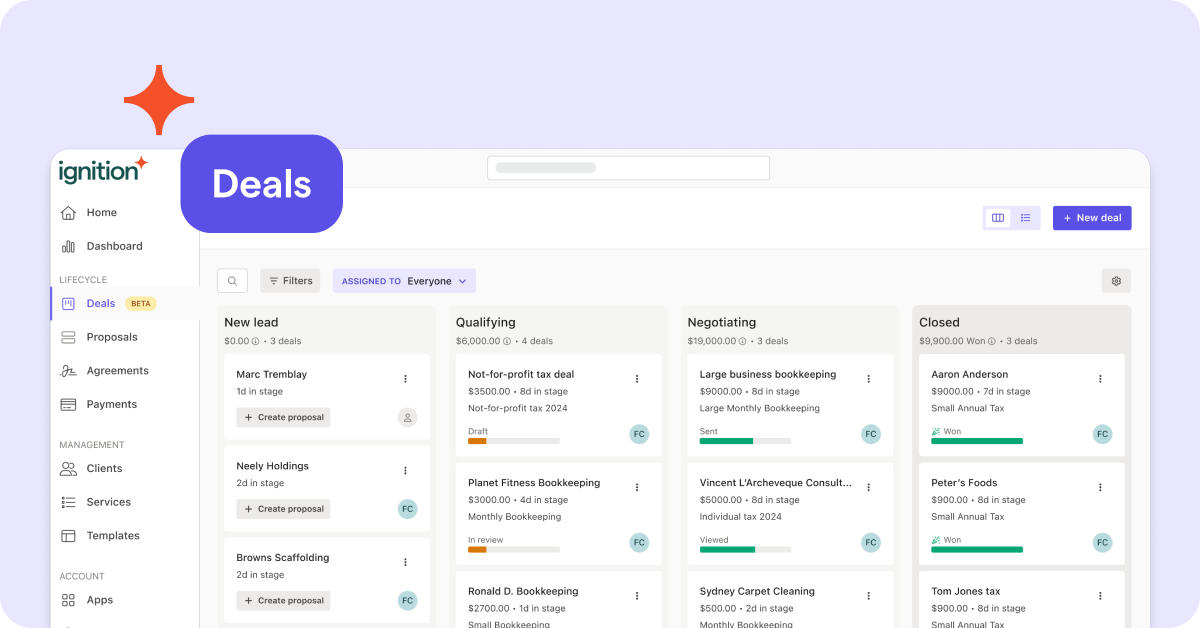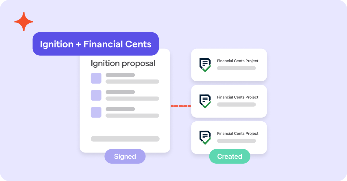 Ignition automatically creates or links clients and contacts in Financial Cents, triggers mapped projects when a proposal is accepted, and keeps records in sync as engagements evolve—eliminating manual setup, duplicate entry and client onboarding delays.