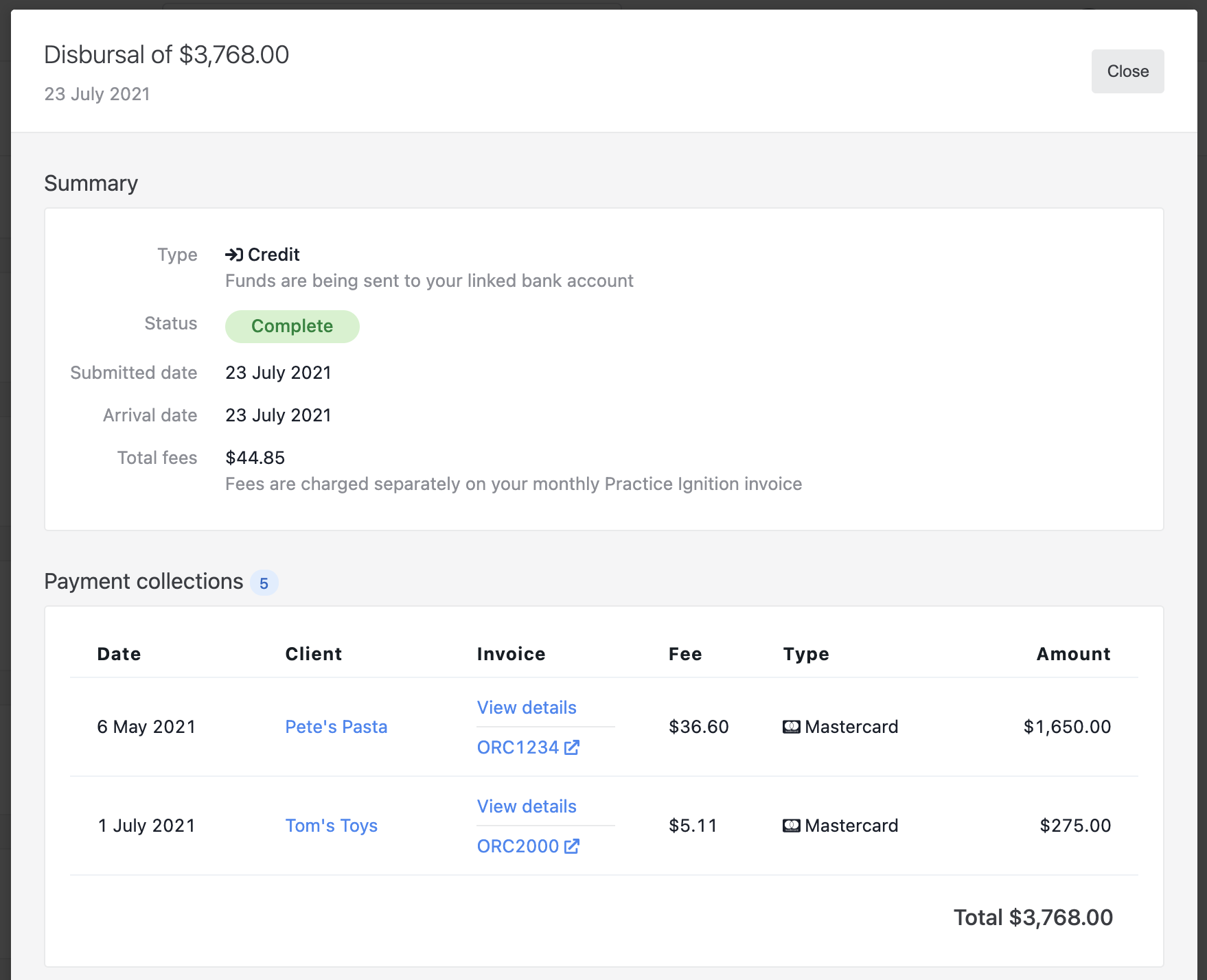 We’ve made it easier to understand what’s happening with your client payments, including any payment disputes or client refunds you’ve issued, via the updated Disbursals view. This tracks when client payments collected through Practice Ignition reach your linked bank account.