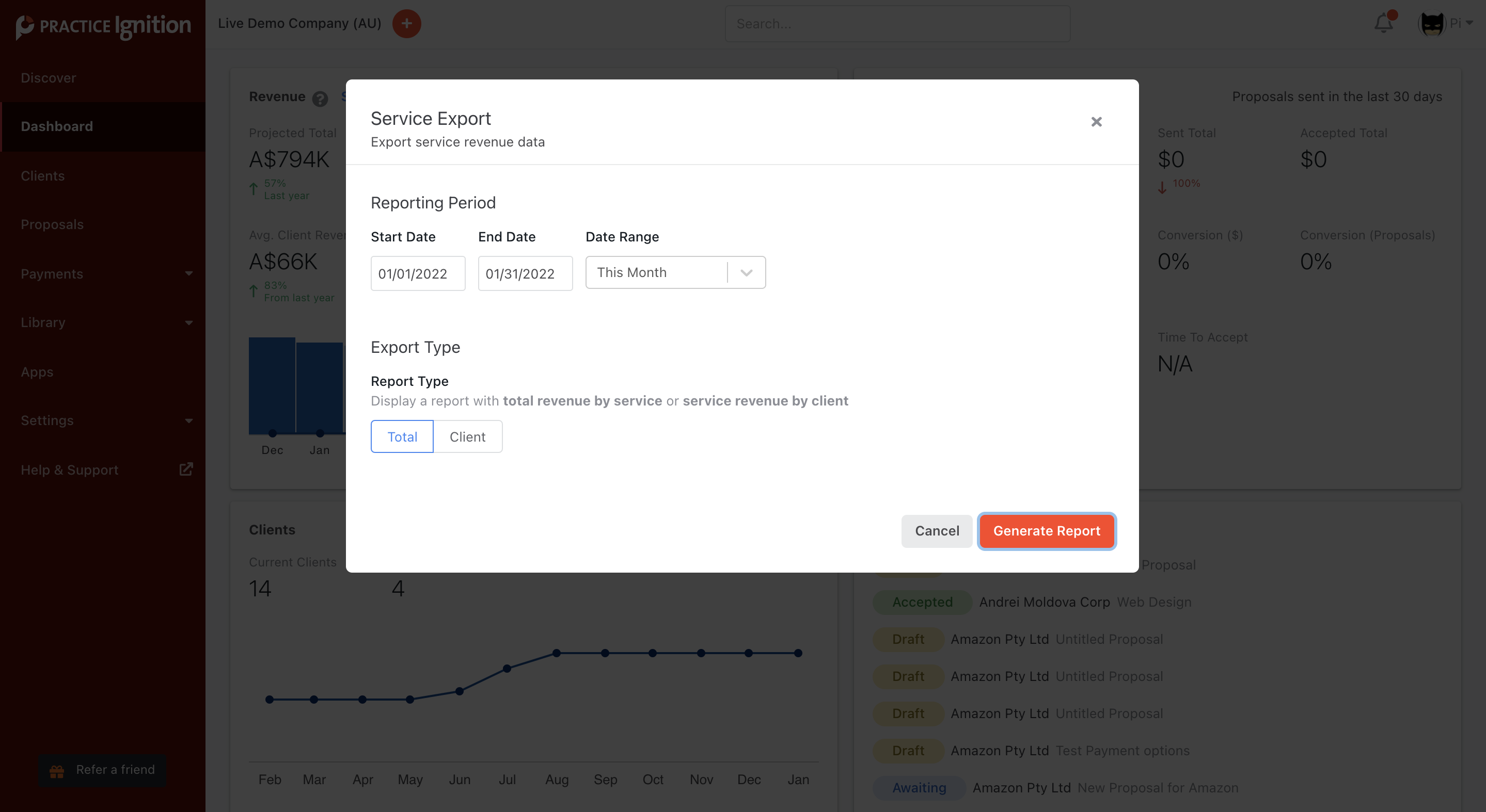 In just a few clicks, you can export a list of your services based on their expiry date so that you can identify exactly which clients are due for renewal and calculate each service value over a specific period of time.