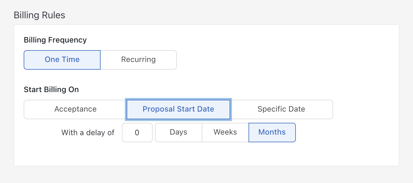 You'll now see a “Proposal Start Date” option in the Start Billing On section the next time you Edit Billing Rules when creating a proposal. In a single click, set the billing start date on your services to always match the start date of your proposal.